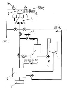 1、控制器;2、泡沫发生器;3、泡沫分离器; 4、化学药品槽;5、泡沫分布装置;6、收集槽; 7、施加器;8、定位辊;9、狭缝压力控制阀 |