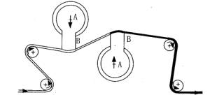泡沫由发泡器连续定量供应传送至泡沫液槽(A),最后到达施加器狭槽(B)中。施加器是由不锈钢材料制成,在泡沫施加部分正下方有一个透明乙酸纤维素材料的观察窗,狭缝的宽度可在0.3mm到25mm之间调节。狭槽斜面与织物的接触角在5°到15°之间。在这种情况下,剪切力使泡沫破裂。泡沫由压力传送到泡沫槽和陕缝内,然后以15°到25°的角度穿过狭缝直接施加到织物上,泡沫渗透到织物的程度是由狭缝压力控制。