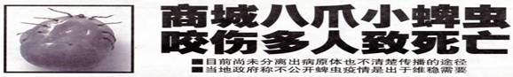 青岛早报 【据《新京报》报道,今年夏天,河南商城县多人被一种叫做“蜱”(读音同皮)的八爪小虫咬伤后不治身亡,引起村民恐慌……,据了解,当地去年已出现死亡病例,但今年尤其多,成为蜱虫“重灾区”。】 对此,人们产生了一种对“蜱虫”莫明的恐慌。青岛早报为弄清原由,通过连日专访,已把情况搞清。本栏特将有关资料综合如下: |