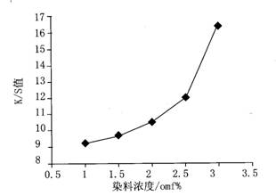 从图中曲线可以看出,浓度较低时染色深度增加缓慢,浓度超过2.5%(omf)后,K/S值迅速增大。因为叶绿素的结构与弱酸性染料相似,分子量大结构复杂,染料与纤维间除了含有离子键外,氢键和范德华力的作用也不容忽视,即染料非定位吸附上染牛奶纤维。此外作为一种极性染料,叶绿素在C02中的溶解度较低,实验浓度范围内,染料并未在超临界流体与纤维间达到溶解和吸收平衡。所以纤维上的染料浓度随染浴浓度增加而呈现一直增大的趋势。