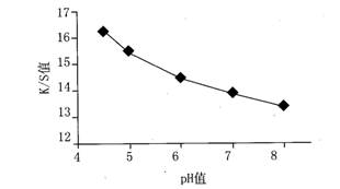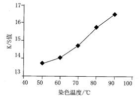 从图中曲线可以看出,K/S值随着染色温度的增加而增加。6O℃之前,纤维的染色深度增加缓慢,但是随着温度升高,染色深度K/S值随之快速升高。这是因为湿法纺丝下所得的牛奶纤维皮层结构紧密,皮层微隙小,低温染色时染料很难扩散通过纤维皮层,上染率很低。而较高的染色温度一方面可以促进牛奶纤维表面皮层的软化膨润,促进染料的吸附、渗透与扩散,另一方面提高了染料的蒸汽压,使其在C02流体中的溶解度增大。图中曲线并没有出现染色深度K/S值趋向缓和的趋势,表明在