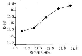 从图中曲线可以看出,K/S值随着染色压力的增大而增大,25MPa前增加显著,25MPa后逐渐趋于缓和。原因是25MPa之前,增加压力将提高C02流体的密度,进而提高对染料的溶解能力,同时压力越大C02流体的渗透性也越强,对牛奶蛋白纤维的染深性越好。而超过25MPa后,C02流体的渗透性增加较少,所以K/S值趋向饱和。